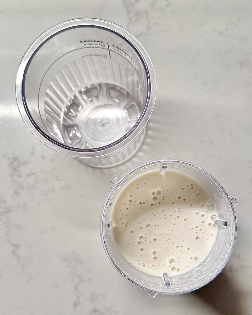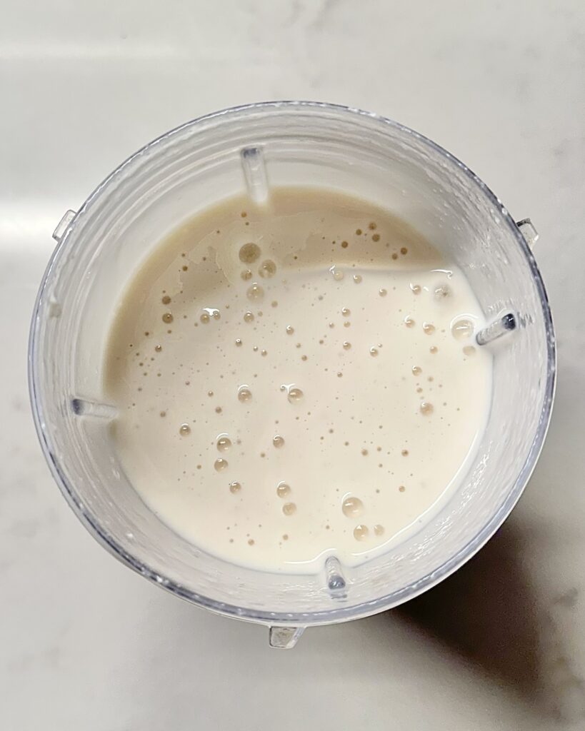 Add the milk, cottage cheese, vanilla protein powder, cheesecake pudding mix, vanilla extract, sweetener, and salt to a blender. Blend until completely smooth. The base should look thick, creamy, and uniform with no cottage cheese texture remaining.
