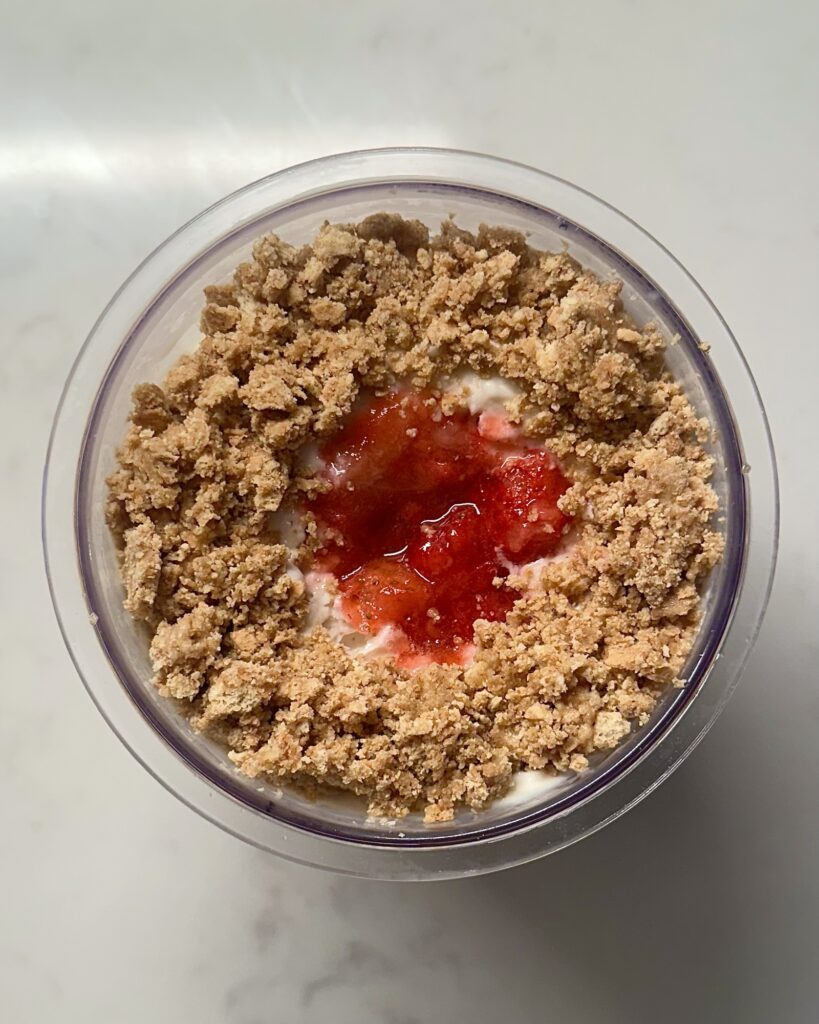 Add the graham cracker crust on top. You can sprinkle it evenly or line it around the inside perimeter of the pint for a classic cheesecake look.
