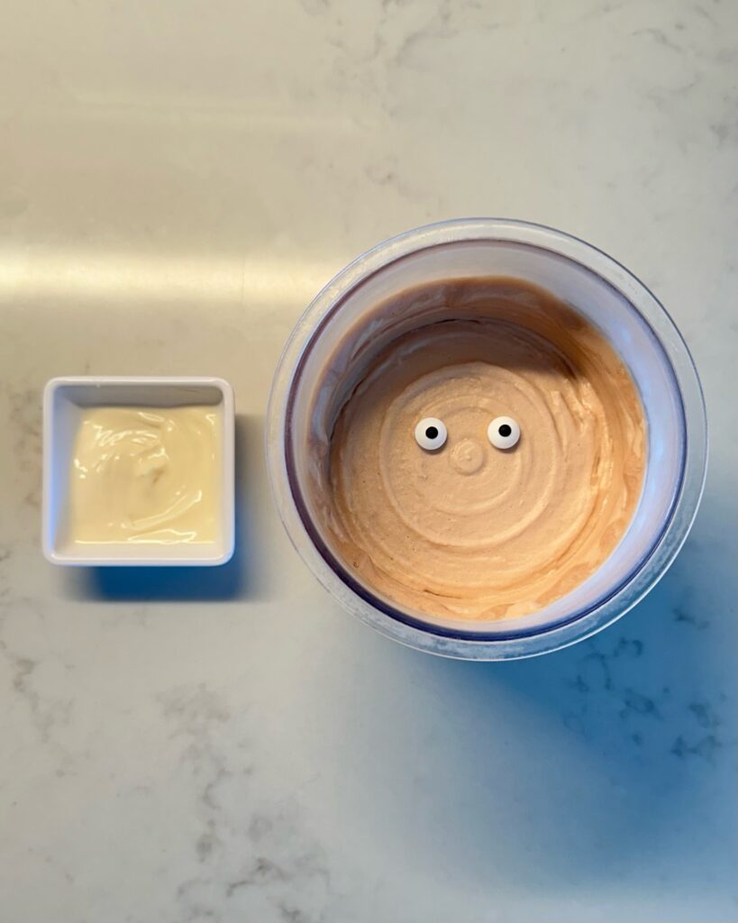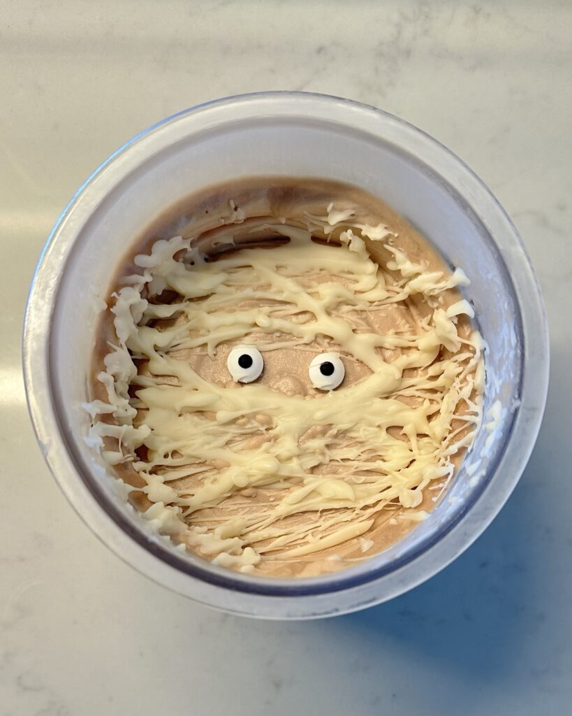 Grab your pint and place the two candy eyes on top. Then use a fork or spoon to drizzle the melted white chocolate over the surface in zigzag / wrap-style lines, back and forth â layering until it looks like mummy wrappings. It doesnât have to be perfect; messy is part of the charm.